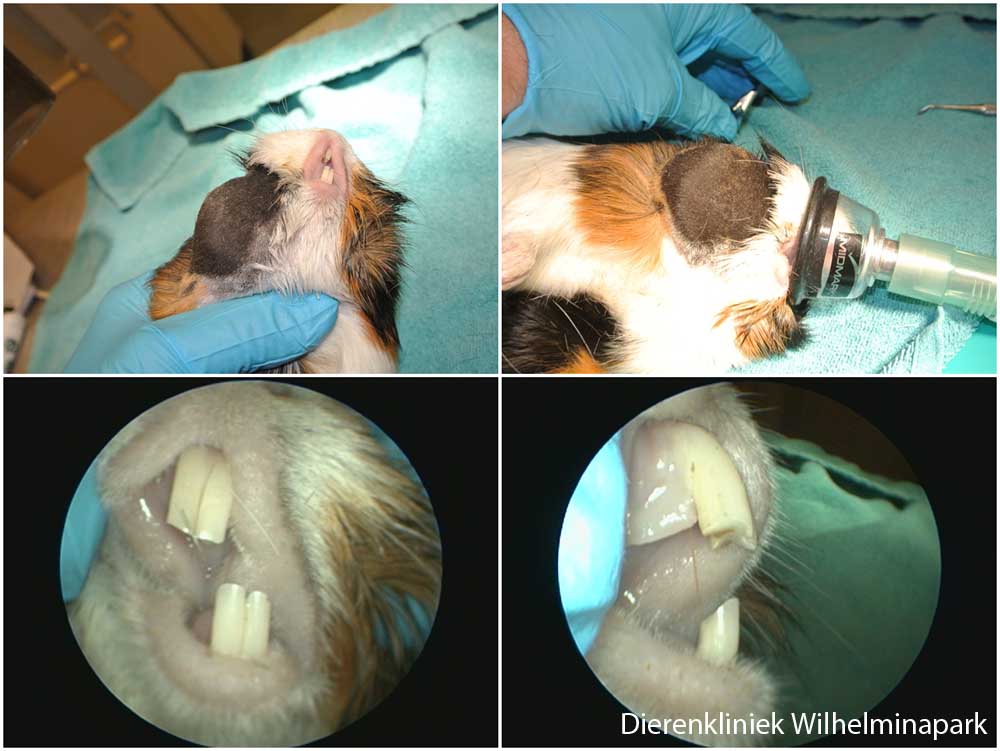 Let op de te lange snijtanden die op elkaar staan en scheef afgesleten zijn. Opvallend is dat er langere snijtanden aan de linkeronderkaak aanwezig zijn, de cavia heeft pijn aan die kant en zal minder stevig aan die zijde willen kauwen.
